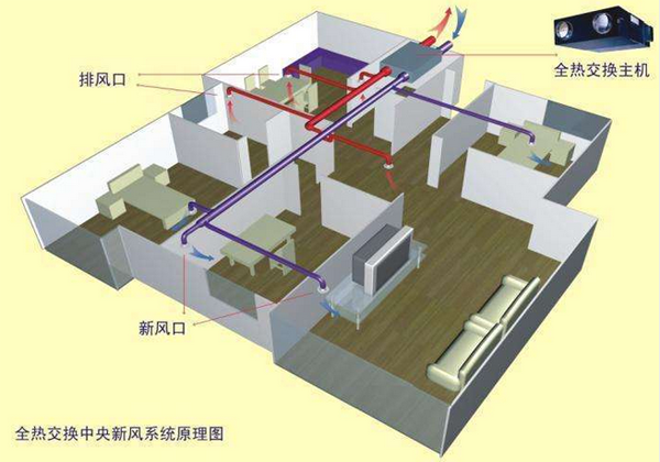 全热交换器新风系统是新风系统的一种,是一种室内通风换气设备,它把密闭的室内空气排放到室外,同时把室外的新鲜空气经过全热交换器的过滤,引入到室内,在室内空气排放到室外和室外新鲜空气进入到室内的过程中,全热交换器把两股不同温度的空气进行热传递,尽可能的降低空调的负荷,达到节能环保的作用。新风系统分为单向流新风、双向流新风和全热交换器新风系统,它兼有新风系统众多优点,是舒适、节能的新风系统。